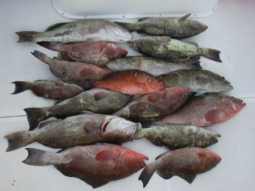 We decided to head a little further offshore. The decision paid off, and it was non stop, BOOM one BIG grouper after anothor. After the first 2 hours in this area, the fish box was staring to get full and all the rods were still bent over the side of the boat. Needless to say, it wasn't long before these guys had their limit of Grouper.